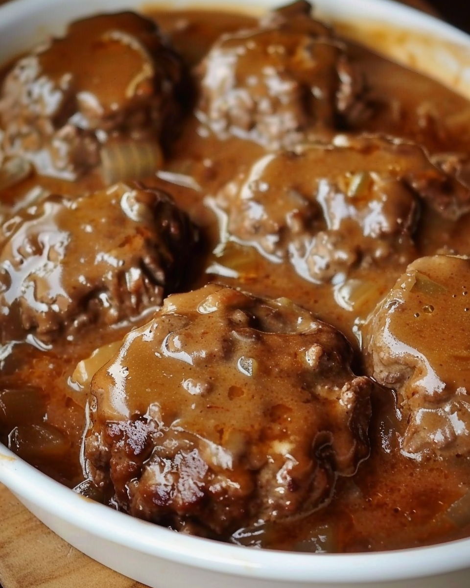 Once that beefy bundle is pan-fried to a glorious golden crown, it’s smothered in a luscious gravy made from condensed cream of mushroom soup thinned out with a splash of water or broth. The entire dish bakes away until that mushroomy elixir has thoroughly infused the patty with soul-stirring, savory succulence.