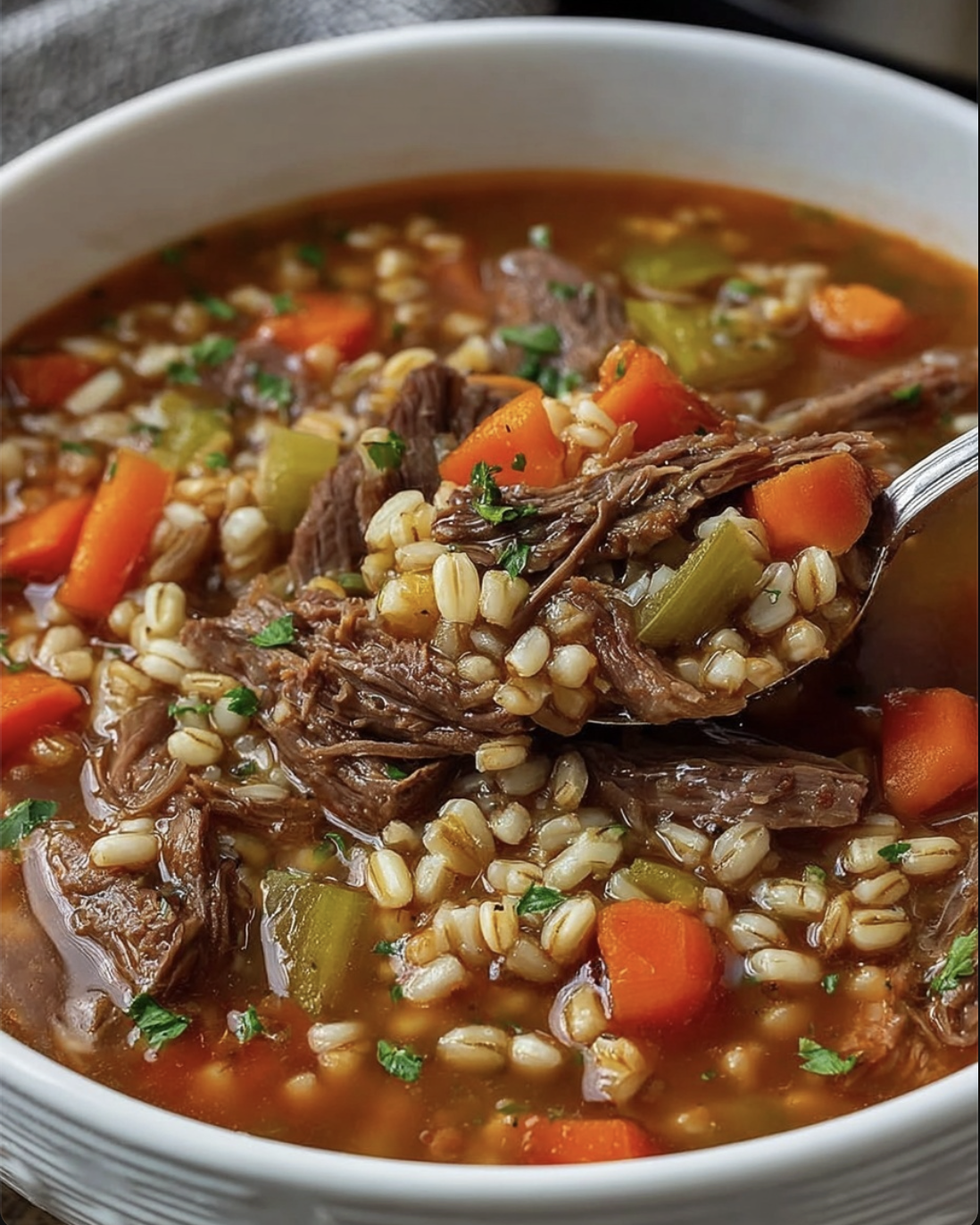 A hearty and comforting beef barley soup cooked in a slow cooker, combining tender beef, chewy barley, and flavorful vegetables for a satisfying and nutritious meal.