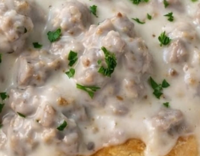 Ingredients :8 buttermilk biscuits1 lb (450 g) breakfast sausage3 tbsp unsalted butter (if needed)¼ cup all-purpose flour2 ½–3 cups whole milk½ tsp salt½ tsp black pepper (or to taste)¼ tsp garlic powder¼ tsp onion powderFresh chopped parsley (optional, for garnish)InstructionsBake the buttermilk biscuits according to package directions or your preferred homemade recipe until golden brown and fluffy inside. Keep warm.In a large skillet over medium heat, cook the breakfast sausage, breaking it apart with a spoon, until fully browned and cooked through. Do not drain the fat unless there is excessive grease.If the pan looks dry, add butter. Sprinkle the flour over the cooked sausage and stir well. Cook for 1–2 minutes to remove the raw flour taste.Gradually pour in the milk while stirring continuously. Bring to a gentle simmer and cook until the gravy thickens to a rich, creamy consistency.Season with salt, black pepper, garlic powder, and onion powder. Adjust seasoning to taste.Split the warm biscuits in half and place them on a plate similar to your photo. Generously spoon the thick sausage gravy over the top, allowing it to cascade down the sides. Sprinkle with fresh parsley if desired and serve immediately.