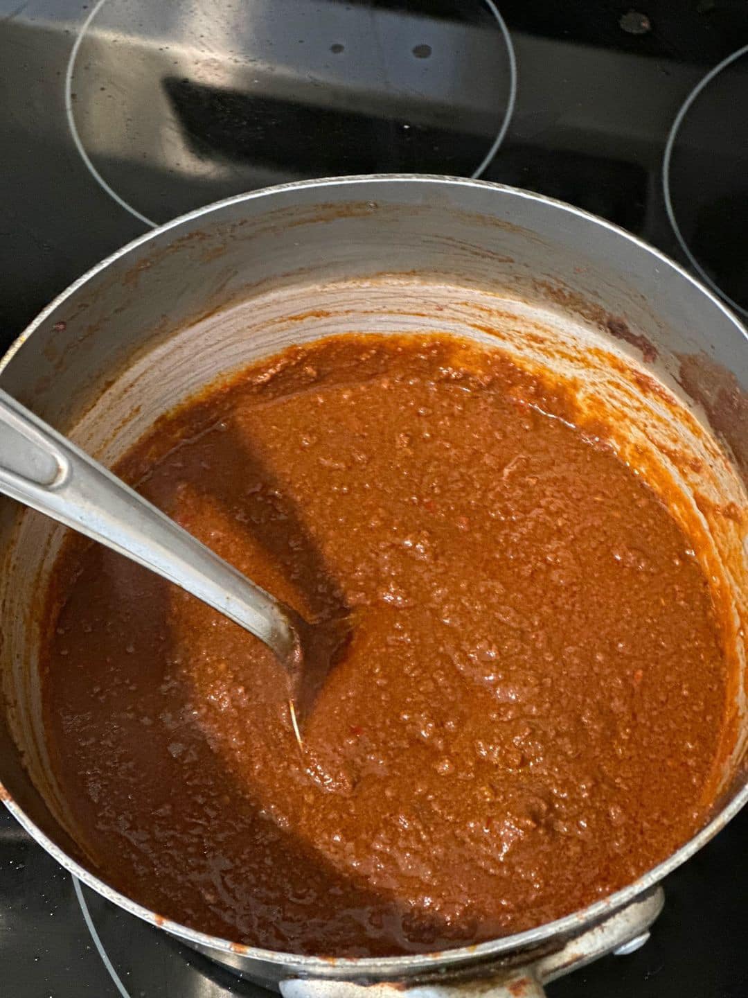 - Add ingredients: Add broth, tomato sauce, chili powder, cocoa powder, Worcestershire sauce, chili flakes, paprika, soy sauce, onion powder, garlic powder, and cayenne pepper.