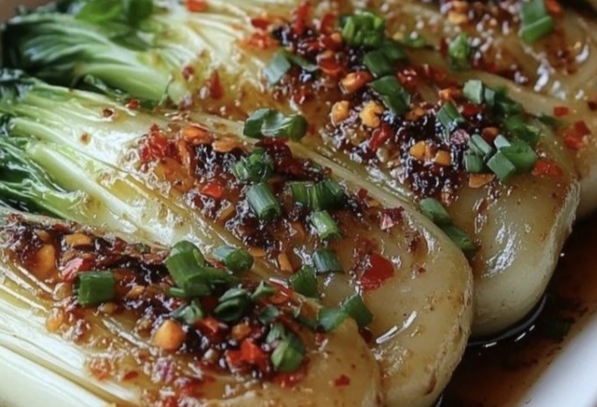 Recipe: Chinese Style Steamed Bok Choy with Chili OilIntroduction: This Chinese-style steamed bok choy with chili oil is a quick and flavorful dish that highlights the natural sweetness and crunch of bok choy, complemented by a rich, savory, and spicy sauce. The steaming process keeps the bok choy tender while the chili oil brings a bold, aromatic kick. This simple yet delicious side dish pairs perfectly with rice or any Asian-inspired meal.Ingredients:6-8 baby bok choy (or regular bok choy, halved)2 tablespoons vegetable oil2 tablespoons soy sauce1 tablespoon oyster sauce1 tablespoon rice vinegar1 tablespoon sugar1-2 teaspoons chili flakes (adjust to taste)1 tablespoon sesame oil2 cloves garlic, minced1 tablespoon fresh ginger, minced2-3 green onions, chopped (for garnish)Instructions:Prepare the bok choy:Cut the bok choy in half lengthwise (if using regular bok choy, cut into quarters). Rinse thoroughly to remove any dirt or grit from between the leaves.Steam the bok choy:Steam the bok choy halves in a steamer basket for about 5-7 minutes, or until the bok choy is tender but still crisp. Set aside.Prepare the chili oil sauce:In a small pan, heat the vegetable oil over medium heat. Add the minced garlic and ginger, and sauté for 1-2 minutes until fragrant.Add the chili flakes and cook for another 30 seconds. Then, add the soy sauce, oyster sauce, rice vinegar, and sugar, stirring to combine. Let the sauce simmer for 1-2 minutes until heated through.Assemble the dish:Arrange the steamed bok choy halves on a serving plate. Pour the hot chili oil sauce evenly over the bok choy.Garnish and serve:Garnish with chopped green onions and a drizzle of sesame oil for an extra layer of flavor. Serve warm.Enjoy this vibrant and flavorful bok choy dish as a side to any main course, or simply as a light, healthy snack!