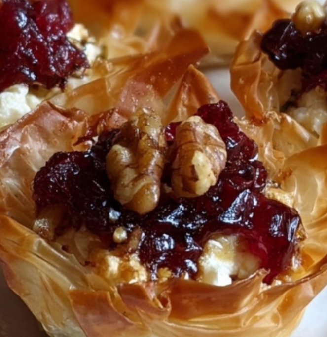 Recipe Introduction: These Cranberry Walnut Filo Cups are a delightful combination of sweet and savory flavors, perfect for holiday gatherings or as a unique appetizer. The crispy filo pastry cups are filled with creamy cheese, tangy cranberry sauce, and topped with crunchy walnuts for a satisfying bite. Quick to prepare and incredibly delicious, they are sure to impress your guests.Ingredients:12 sheets of filo pastry1/4 cup melted butter1 cup cream cheese, softened1/4 cup goat cheese (optional)1/4 cup sour cream1/2 cup cranberry sauce (store-bought or homemade)1/4 cup chopped walnutsHoney for drizzling (optional)Instructions:Preheat your oven to 350°F (175°C).Brush each sheet of filo pastry with melted butter and stack them on top of each other. Cut the layered filo sheets into 6-inch squares.Gently press the filo squares into a muffin tin to form small cups. Bake in the preheated oven for 10-12 minutes or until the filo pastry is golden and crispy. Remove from the oven and set aside.In a bowl, combine the cream cheese, goat cheese (if using), and sour cream. Mix until smooth and well combined.Spoon the cream cheese mixture into each filo cup, filling them halfway.Top each cup with a spoonful of cranberry sauce.Sprinkle the chopped walnuts on top for added crunch and flavor.Optional: Drizzle a small amount of honey over the top for extra sweetness.Return the cups to the oven for an additional 5 minutes, just to heat everything through.Serve warm and enjoy the perfect blend of flavors!Tip: You can make the filo cups ahead of time and store them in an airtight container. Reheat in the oven before serving.