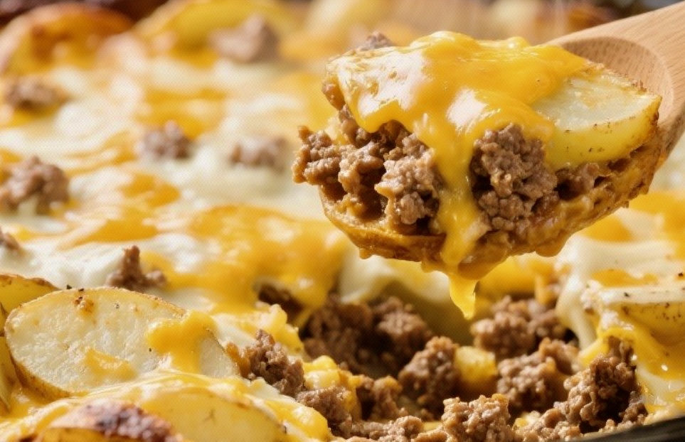 Spread half of the cooked beef mixture over the potatoes, then pour half of the cream sauce over the beef. Sprinkle with 1 cup of the cheddar cheese. Repeat the layers with the remaining potatoes, beef, and sauce. Reserve the remaining cheese for later.