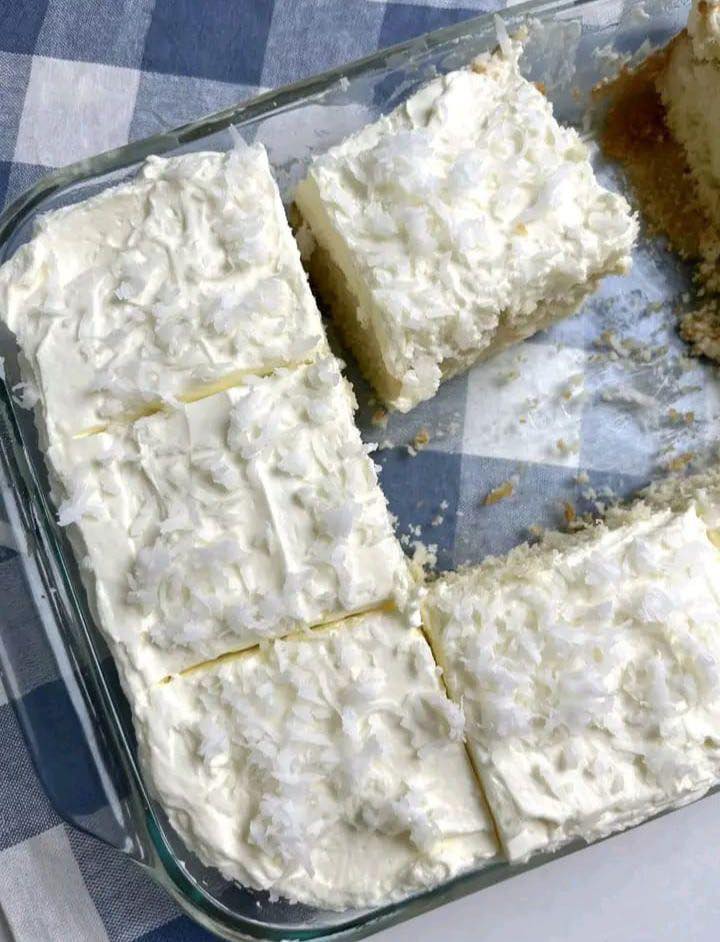 - Step 6: Frost & Garnish: Spread the whipped cream over the cooled cake and sprinkle with additional shredded coconut. Slice into squares and serve.