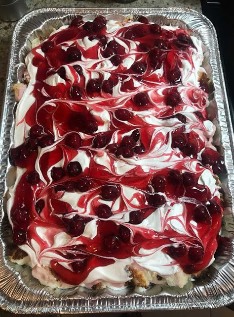 In a 13 * 9 baking dish, placing half of cake cubes in bottom of pan. Placing half a spoonful of cherry pie filling on top of cake.