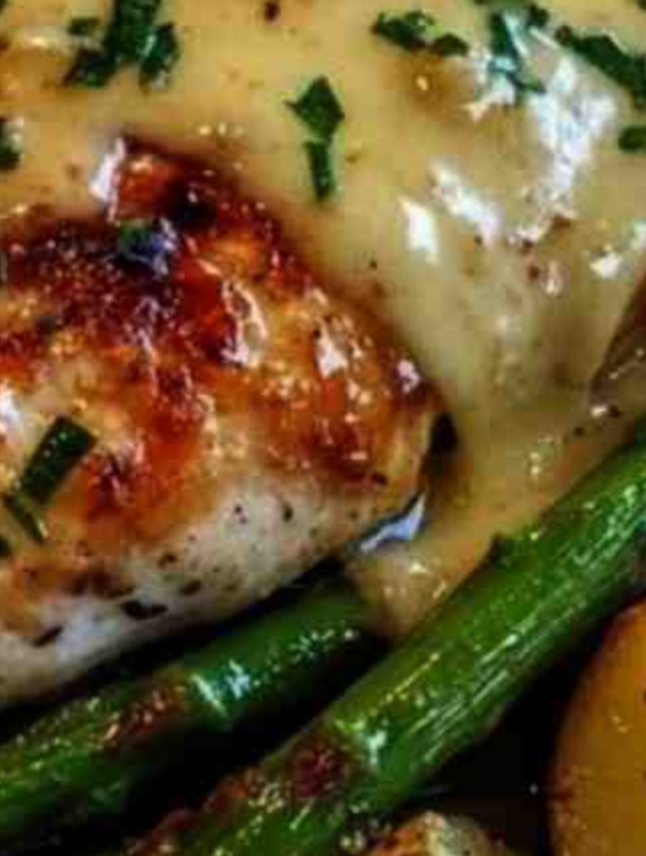 This honey mustard chicken recipe is a restaurant-worthy dish made with just a few simple ingredients.It’s paired with crispy roasted potatoes and tender asparagus, all smothered in a creamy Dijon sauce that’s both tangy and sweet. Perfect for an elegant dinner or a cozy weekend meal.Ingredients4 boneless, skinless chicken breasts4 tablespoons honey3 tablespoons Dijon mustardADVERTISEMENT2 cloves garlic, minced500g fresh asparagus (about 1 bunch)4 medium potatoes, cubed2 tablespoons olive oilSalt and black pepper, to tasteADVERTISEMENTFresh herbs (chives or parsley), optional for garnishGrated cheese (optional – sprinkle over potatoes before baking)InstructionsPreheat oven to 400°F (200°C).In a small bowl, mix together honey, Dijon mustard, and minced garlic.Season chicken breasts with salt and pepper. Set aside.ADVERTISEMENTToss cubed potatoes in olive oil, salt, and pepper. Spread on a baking sheet and roast for 20 minutes.While potatoes are roasting, heat a skillet over medium-high heat.Sear chicken breasts for 2–3 minutes per side until golden.Remove chicken from heat and brush generously with the honey mustard mixture.Add asparagus to the baking tray with potatoes. Place the seared chicken on top.Roast everything together in the oven for 15–20 more minutes, until chicken is fully cooked and potatoes are crispy.ADVERTISEMENTDrizzle remaining honey mustard sauce over the chicken.Garnish with fresh herbs and serve hot.Time & NutritionPrep Time: 10 minutesCook Time: 35–40 minutesTotal Time: ~50 minutesServings: 4Calories: ~420 kcal per serving (without cheese)Serving SuggestionsServe with crusty bread, rice pilaf, or a side salad.Add grated Parmesan or cheddar over potatoes for a cheesier twist.ADVERTISEMENTLeftovers work great in wraps or lunch bowls the next day.Enjoy!