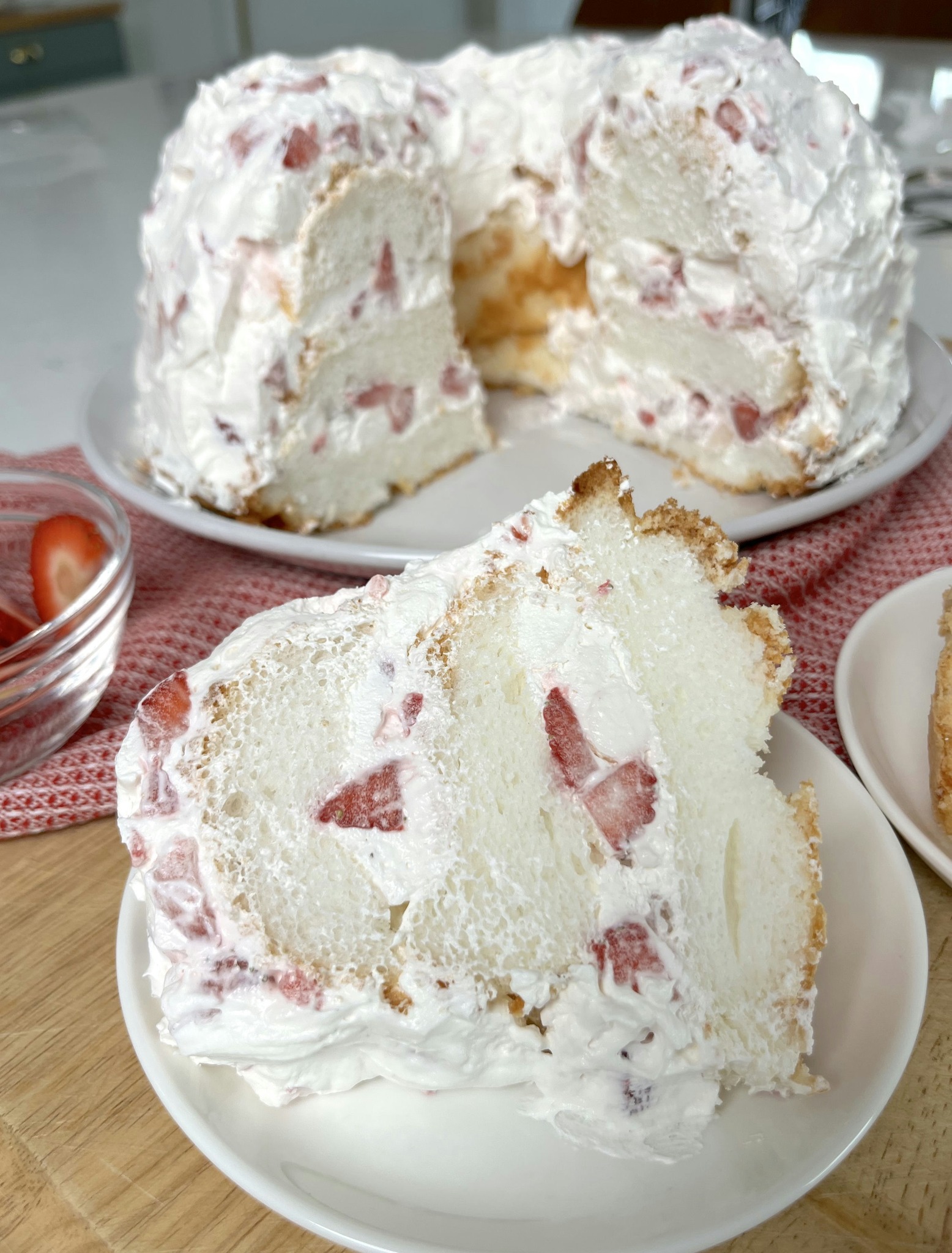 - Slice and serve the Strawberry Angel Cake chilled.