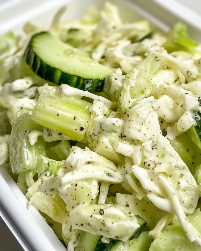 This Creamy Peppery Coleslaw is a refreshing twist on a classic picnic favorite. With the added crunch of fresh cucumbers and celery, this coleslaw has a bright and vibrant texture. The creamy, zesty dressing, with its hint of black pepper and Dijon mustard, perfectly complements the crisp vegetables, making it an excellent side dish for grilled meats, sandwiches, or barbecues.