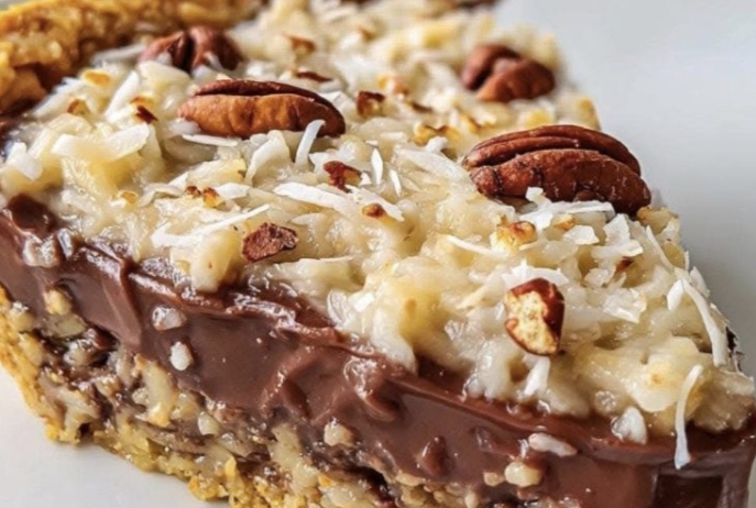 No-Bake German Chocolate PieIf you’re looking for a quick and delicious dessert that combines the rich flavors of chocolate, coconut, and pecans, this No-Bake German Chocolate Pie is the perfect choice! With its creamy chocolate pudding filling, topped with a sweet coconut-pecan mixture, this pie is a crowd-pleaser that requires no baking—making it the ideal dessert for hot summer days or when you’re short on time.Ingredients:1 (9-inch) prepared graham cracker crust1 package instant chocolate pudding mix1 3/4 cups cold milk1 cup shredded sweetened coconut1/2 cup chopped pecansInstructions:Prepare the pudding: In a large mixing bowl, whisk together the instant chocolate pudding mix and cold milk. Whisk until the mixture thickens (about 2 minutes). Once thickened, pour the pudding into the prepared graham cracker crust.Make the topping: In a separate bowl, combine the shredded coconut and chopped pecans. Stir to mix them together.Assemble the pie: Sprinkle the coconut and pecan mixture evenly over the chocolate pudding layer in the crust.Chill the pie: Place the pie in the refrigerator for at least 3 hours or until it has fully set. This allows the pudding to firm up and the flavors to blend.Serve and enjoy: Once chilled, slice the pie and enjoy the creamy, rich, and nutty flavors of this no-bake treat!This No-Bake German Chocolate Pie is easy to make, requires minimal ingredients, and is guaranteed to satisfy your sweet tooth! It’s perfect for any occasion, and you’ll be amazed at how quickly it comes together. Enjoy! 🍫🥥🌰