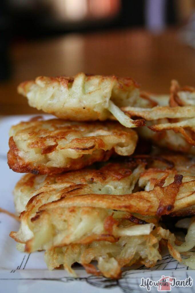 Some people serve them with apple sauce or sour cream. Another faction serves them with a fried egg on top. The best idea I’ve come across is to top them with slices of pear and brie. Your call! I can’t imagine them being anything other than delicious.