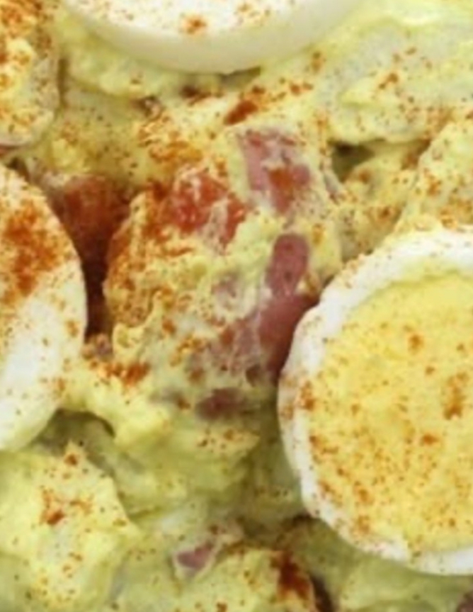 Ingredients3 lbs red potatoes, cubed1/2 cup sliced salad olives with minced pimentos1 tsp onion powder1 tsp garlic powder1 cup mayonnaise4 Tbsp yellow mustardSalt and black pepper, to taste5 hard-boiled eggsInstructions1. Prepare the PotatoesWash and cut the red potatoes into evenly sized cubes to ensure uniform cooking.Place potatoes in a large pot and cover with cold water. Add a generous pinch of salt.Bring to a boil, then simmer until the potatoes are fork-tender (about 10–15 minutes).Drain the potatoes and let them cool to room temperature.2. Make the DressingIn a large mixing bowl, combine:MayonnaiseMustardOnion powderGarlic powderSalad olives with pimentosSalt and pepper to tasteMix until well blended.3. Combine Potatoes and DressingAdd the cooled potatoes to the bowl with the dressing.Gently fold the ingredients together to coat the potatoes without breaking them apart.4. Add the Hard-Boiled EggsSlice 3 of the hard-boiled eggs and gently fold them into the salad.Slice the remaining 2 eggs and arrange them on top of the salad for garnish.Tips for Best ResultsCool the potatoes fully before adding the dressing to prevent the mayonnaise from separating.Use waxy potatoes like red or Yukon Gold—they hold their shape better than russets.Customize the flavor by adding chopped celery, green onions, or a dash of smoked paprika for color and depth.StorageStore in an airtight container in the refrigerator for up to 3 days. Best served chilled.