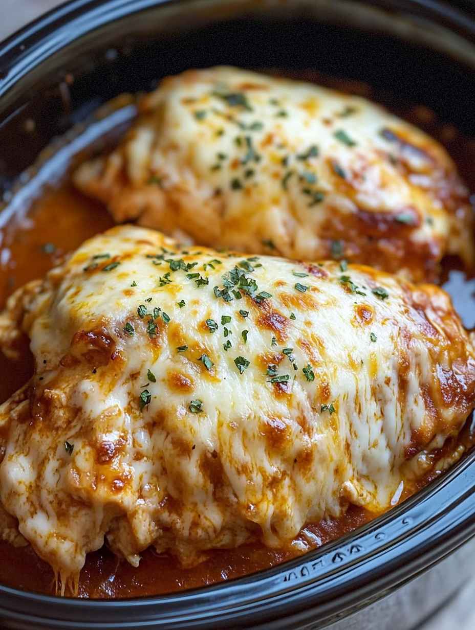 Tender chicken breasts smothered in marinara and melty mozzarella, all made effortlessly in your slow cooker!
