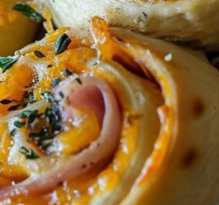 Ingredients:1 pound pizza dough (homemade or store-bought)12 slices smoked ham (thinly sliced)1 1/2 cups shredded sharp cheddar cheeseInstructions:Preheat your oven to 375°F (190°C) and line a baking sheet with parchment paper.On a floured surface, roll out the pizza dough into a 1/4-inch-thick rectangle.Lay the ham slices over the dough, leaving a small border around the edges.Evenly spread the shredded cheese over the ham.Roll the dough tightly from a long edge, as you would a jelly roll.Cut the log into 1-inch sections and place them on the baking sheet.Bake for 18-20 minutes until golden brown and the cheese is bubbly.Let cool slightly before serving.Variations & Tips:Add red pepper flakes or hot sauce to the cheese for a spicy kick.Experiment with different cheeses like Gruyere, Swiss, or smoked provolone.For a vegetarian version, use sautéed spinach and mushrooms (drained of moisture) instead of ham.Brush the tops with melted butter and garlic powder before baking for extra indulgence.Let the dough rest at room temperature for easier handling.Feel free to customize these roll-ups with your favorite ingredients, keeping in mind not to overstuff them. Enjoy the process and the delicious result of this simple, yet delightful dish!Enjoy!