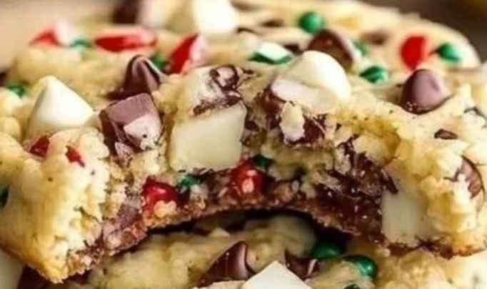 Ingredients1 cup unsalted butter, softened1 cup granulated sugar1 cup packed brown sugar2 large eggs2 teaspoons vanilla extract3 cups all-purpose flour1 teaspoon baking soda1/2 teaspoon baking powder1/4 teaspoon salt2 cups chocolate chips1 cup crushed candy canes1/2 cup white chocolate chipsSnowflake sprinkles, for decorationDirections1. Preheat your oven to 350°F (175°C) and line a baking sheet with parchment paper.2. In a large bowl, cream together the butter, granulated sugar, and brown sugar until light and fluffy.3. Beat in the eggs one at a time, then stir in the vanilla extract.4. In another bowl, whisk together the flour, baking soda, baking powder, and salt.5. Gradually add the dry mixture to the wet ingredients, mixing until just combined.6. Fold in the chocolate chips, crushed candy canes, and white chocolate chips.7. Drop rounded tablespoons of dough onto the prepared baking sheet, leaving enough space for spreading.8. Decorate the tops of the cookies with snowflake sprinkles.9. Bake for 10-12 minutes, or until the edges are golden brown.10. Allow the cookies to cool on the baking sheet for 5 minutes before transferring to a wire rack to cool completely.Enjoy!